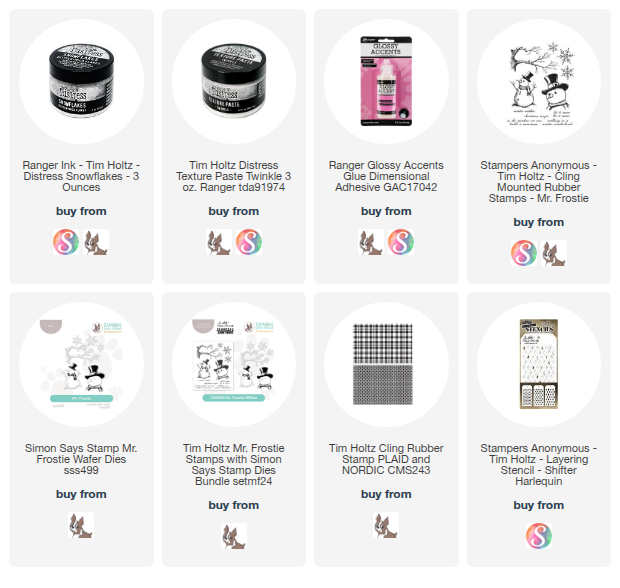I gathered the new products as well as Mr Frostie CMS499 as well as the coordinating dies from Simon Says Stamp (all products are linked below) and I added the Plaid and Nordic CMS243 background stamps and the Small Harlequin Shifter Stencil. You will also want some Distress Inks and Stains, Watercolor Paper, White Heavystock and Glossy Accents or Collage Medium.