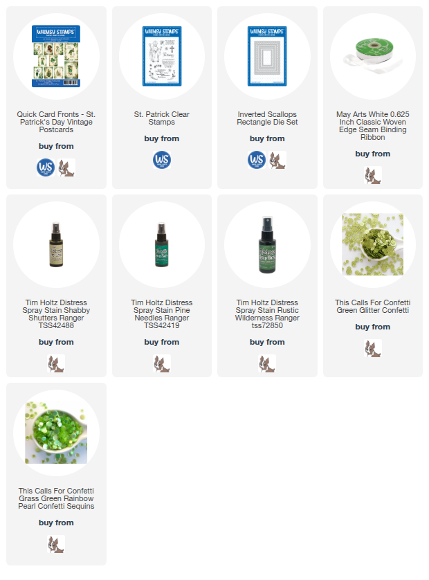 I needed more St. Patrick's Day Cards! So I reached for my pack of St. Patrick's Day Vintage Postcard Quick Card Fronts from Whimsy Stamps. These are so gorgeous I really didn't need to do anything to them, but I did die cut the focal points out and popped them up just slightly. Then added some Distress Stained muslin ribbon and some sequin confetti.